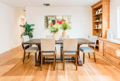 medium brown wood table with beam below table top and V like beams from top to bottom Chandler Dining Table