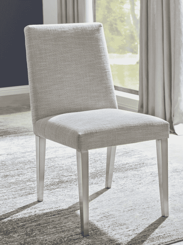 light grey upholstered dining chair with silver legs