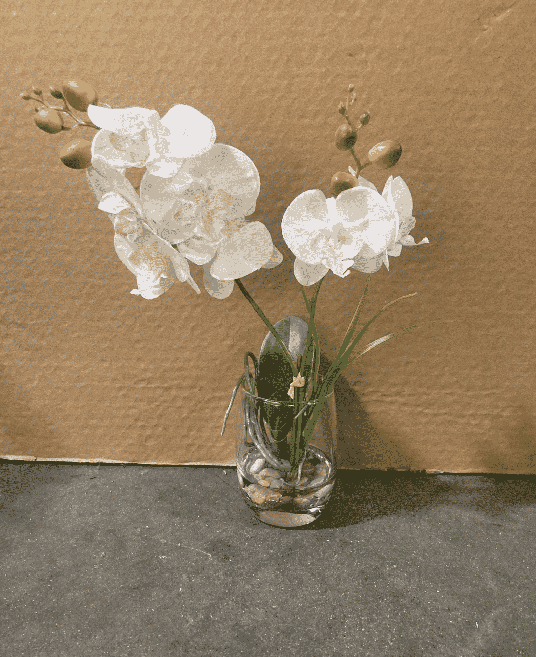 White & Blush Orchid in Glass Cup 3×12″